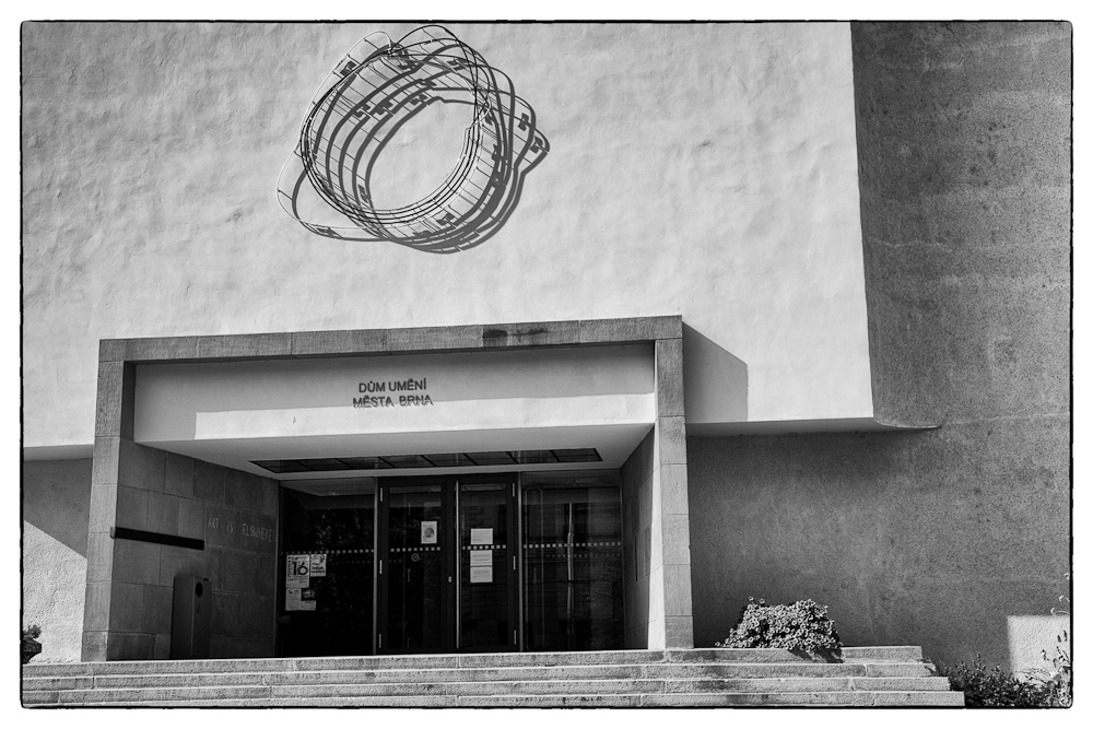 Funkcionalistická budova je od architekta Bohuslava Fuchse, původně však byla postavena v secesním slohu. V popředí busta maršála Malinovského.