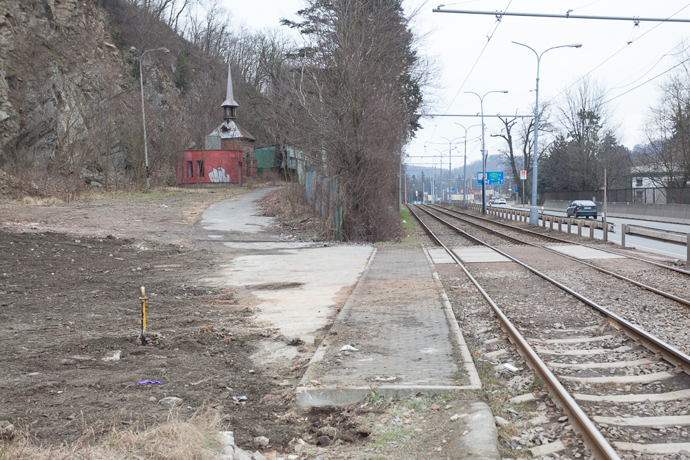 V roce 2015 se komunikace z 70 let bude dále rozšiřovat na 4 pruhy a byly tedy demolovány překážející komerční objekty skladů a dílen. V únoru 2015 stojí pouze staré depo a zřejmě nějaký vodárenský kruhový objekt u kapličky.