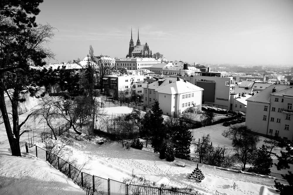 Pohled na katedrálu svatého Petra a Pavla z radniční věže. Byla postavena na přelomu 19tého a 20tého století a jeho věže jsou 85m vysoké. Ostroh na kterém katedrála stojí se jmenuje Petrov a takto se i tato katedrála běžně pojmenovává.