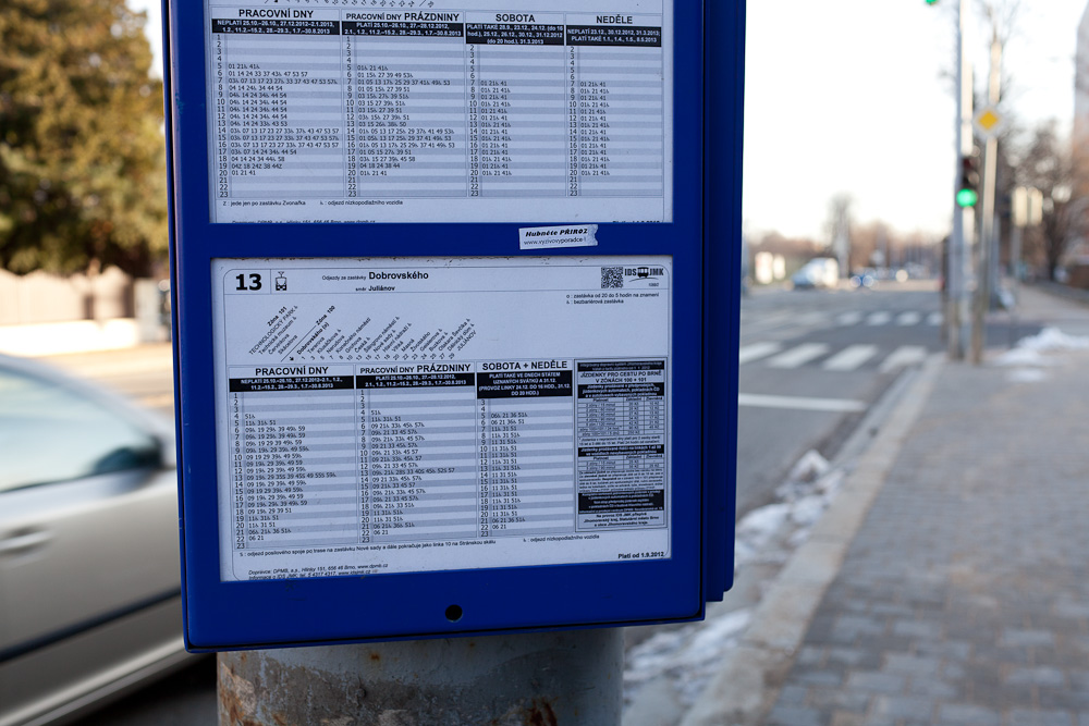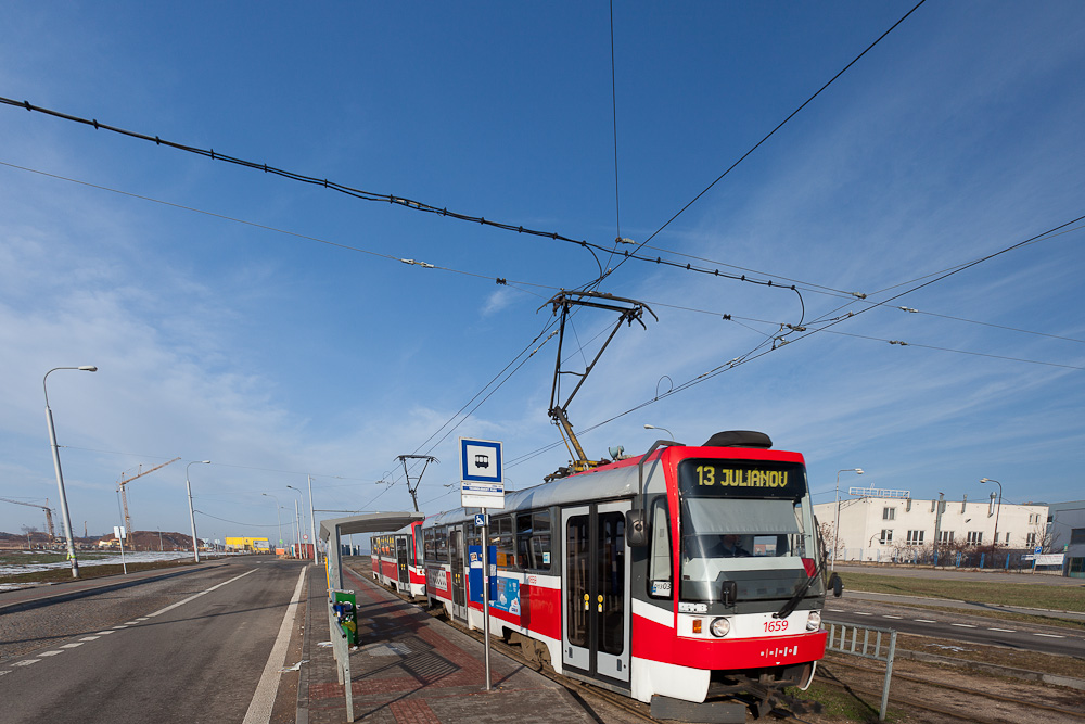 Linka číslo 13 je v provozu od prosince 1962, přičemž ve známé trase Juliánov – Královo Pole Tesla začala linka jezdit na jaře 1964. Od 1.1.2013 byla linka zrušena a je nahrazena linkou č. 9 z Juliánova na Lesnou a zároveň byla posílena linka č. 12 z Komárova do Technologického parku. Fotografie jsou z posledního dne provozu, tedy 31.12.2012.